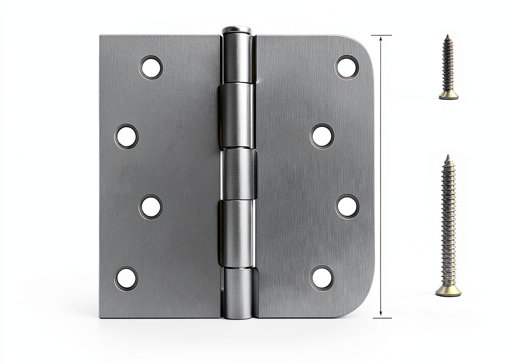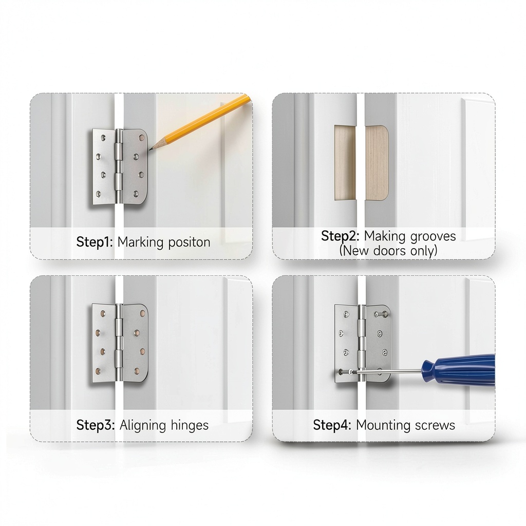 Installation is straightforward using the included self-tapping screws; mount the hinges on the door frame and door, ensuring alignment for smooth movement.