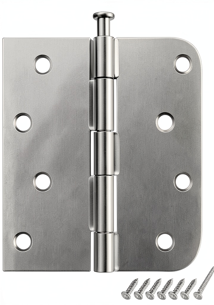 HOSOM door hinges are engineered for durability and functionality, featuring a 4-inch design with 5/8-inch radius corners made from high-strength iron. Available in brushed nickel and matte black finishes, these hinges support a maximum weight capacity of 60 pounds and withstand over 350,000 open-close cycles, making them suitable for demanding residential applications. Each set includes hinges, self-tapping screws, and a pin removal screw, with dimensions of 4 inches in length and width. The hinges are door-mounted with 24 holes for secure installation, and the anti-corrosion coating ensures long-term reliability without squeaking during operation.