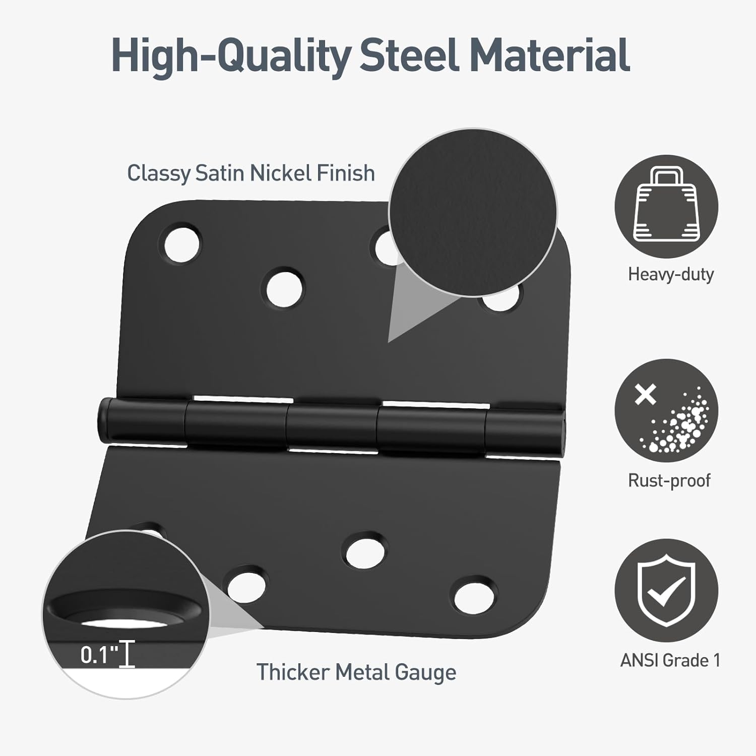 HOSOM door hinges are crafted from heavy-duty steel with a matte black or brushed nickel finish, providing excellent rust and corrosion resistance. These hinges measure 4″L x 4″W and feature a 5/8″ radius corner with 8 screw holes for secure mounting. Each pack includes screws (#9 3/4″ and #9 1-1/2″) and supports up to 60 pounds, making them suitable for various door types. With ANSI GRADE 1 certification, they ensure durability and long service life, ideal for both standard interior and exterior applications.