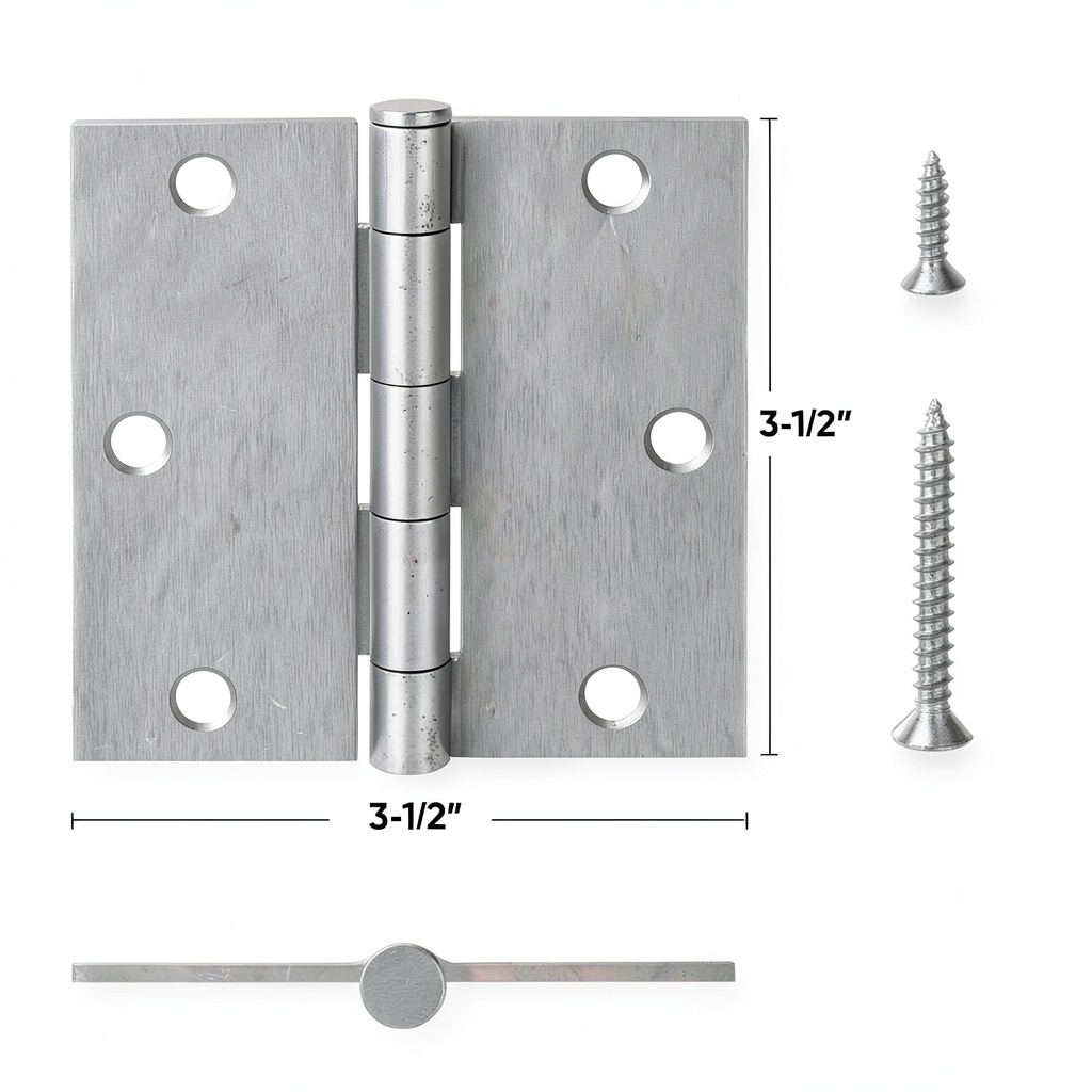 Each hinge pack includes six 0.75-inch short screws and one 1.5-inch long screw with matching satin chrome finish. The long screw helps secure the hinge to the door frame stud when needed.